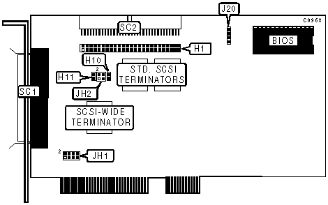 | Note: Opening JH2/pins 1 & 2 enables standard SCSI |