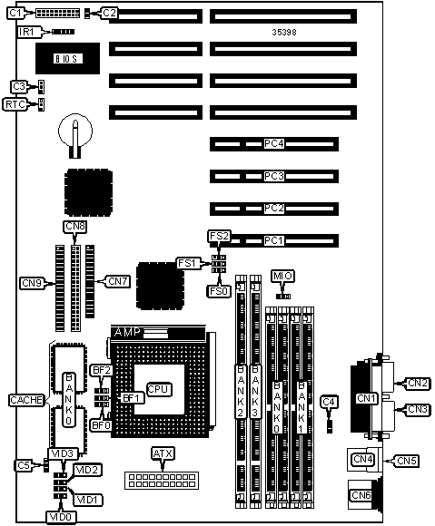 | CPU fan power | C5 | 32-bit PCI slots | PC1 – PC4 |