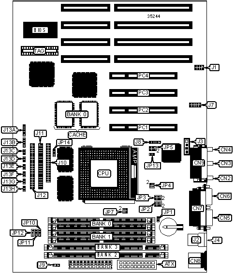 | Audio in – CD-ROM | J3 | ATX LED | J13H |