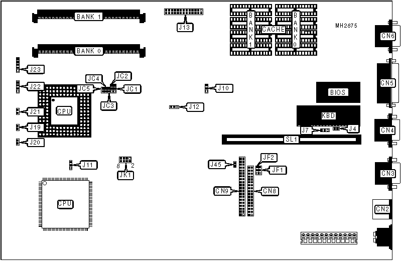 | PS/2 mouse port | CN2 | Turbo switch | J19 |
