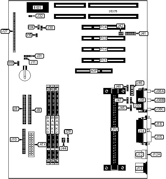 | Floppy drive | J10 | Game/MIDI port | J38 |