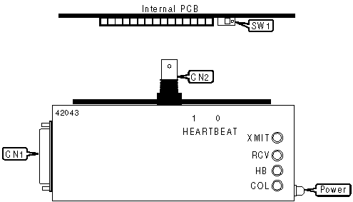 | AUI transceiver via DB-15 | CN1 | BNC connector | CN2 |