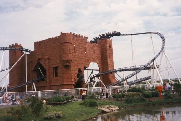 IMG The Tower of Terror, Camelot Theme Park, circa 1990s; a steel rollercoaster track dips in and out of a fibreglass castle structure.