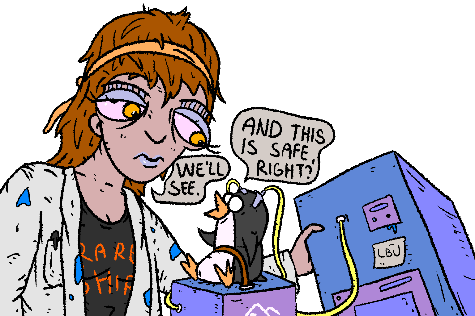 IMG A mad scientist Girl with a t-shirt labeled "rare t-shirt" is looking at a penguin strapped on a Frankenstein like machine, with his head connected to a huge box with LBU written on it.