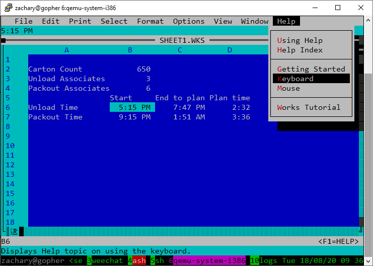 Microsoft Works 2.0 via SSH (or mosh), I'm running it on top of MS-DOS