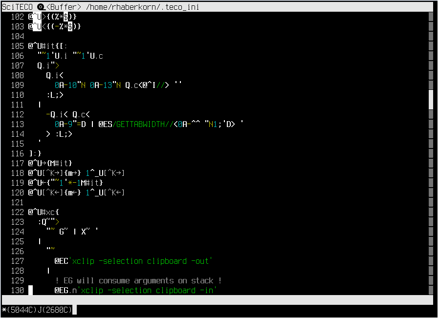 @@@@@@ @@@@@@@ @@@ @@@@@@@ @@@@@@@@ @@@ !@@ !@@ @@! !@! !@! !@! !!@@!! !@! !!@ !!@!!! !!! !!! !:! :!! !!: !:! :!: :!: :::: :: ::: ::: :: :: : : :: :: : : @@@@@@@ @@@@@@@@ @@@@@@@ ..... @@@@@@@ @@@@@@@@ @@@@@@@@ ....,";;;;;;,. @@! @@! !@@ ....,;:::ccccc::;. !@! !@! !@! ...."ccc. ;dxxoc:;. @!! @!!!:! !@! ,,,,lll: dO0xkc:; !!! !!!!!: !!! ,','llcc ;@@00lc: !!: !!: :!! ....;::o. .Ok00kcc, :!: :!: :!: ....;::l;"k00xdc:; :: :: :::: ::: ::: ...";;;:ccc:;;. : : :: :: :: :: : :";;" Scintilla-based Text Editor and Corrector SciTECO is an interactive TECO dialect, similar to Video TECO. It also adds features from classic TECO-11, as well as unique new ideas. GIF Screenshot The basic approach to text editing is both radically differ- ent and surprisingly similar to popular editors like Vi or EMacs. Instead of using mostly keyboard commands to modify text in a visual manner, in SciTECO you edit a program (called macro) using very few keyboard commands (called immediate edit- ing commands). This program edits text for the user and is exe- cuted immediately, as far as possible. For instance, moving the cursor to the right can be done immediatly via the "C" command which is a part of the editor language. The language is the ed- itor so to speak. When you delete a character from the end of the command line macro (called rubout), the side-effects of that character which may be a command or part of a command, are undone. SciTECO can also be used as a scripting language. The fol- lowing program calculates the value of PI: \Un Qn"= 20Un ' 0Uh 0Uv HK Qn< J 0Uq Qn*10/3Ui Qi< (\+2)*10+(Qq*Qi)Ua 0L :K$ Qi*2-1Uj Qa/QjUq Qa-(Qq*Qj)-2\ 10@I// -%i > Qq/10Ut Qh+Qt+48Uw Qw-58"= 48Uw %v$ ' Qv"N Qv-^^0= ' QwUv Qq-(Qt*10)Uh > Qv-^^0= -EX It is based on HTML PI.TEC by Stanley Rabinowitz TEXT sciteco(1) documents how to launch the SciTECO editor.. TEXT sciteco(7) is the main language description for the SciTECO language. HTML SciTECO on the World Wide Web contains more information about the project.
