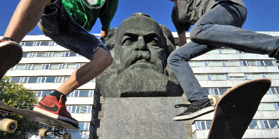 IMG Bild: Skater und der Karl-Marx-Kopf in der Chemnitzer Innenstadt.