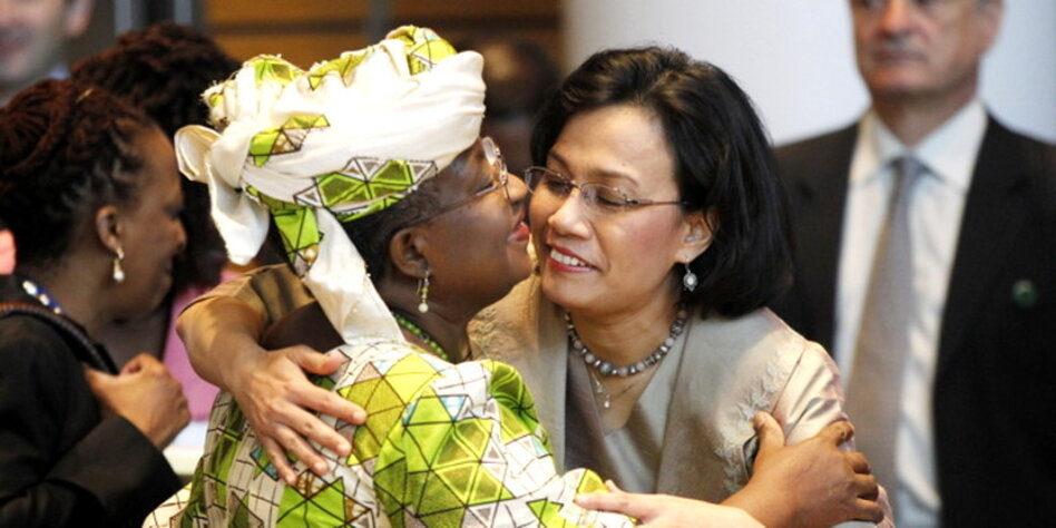 IMG Bild: Weltbankmanagerin Sri Mulyani Indrawati herzt Nigerias Finanzministerin Ngozi Okonjo-Iweala.