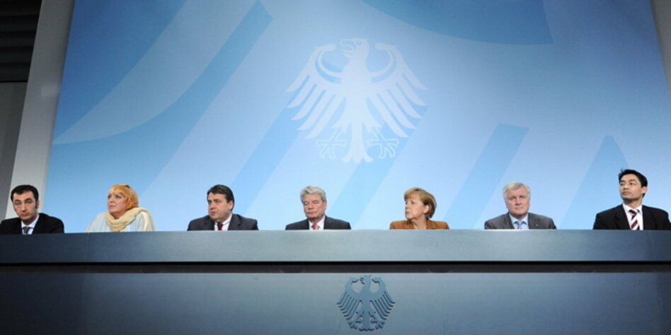 IMG Bild: In einer Reihe und doch nicht wirklich einig: Die Spitzen der Parteien – und Joachim Gauck.