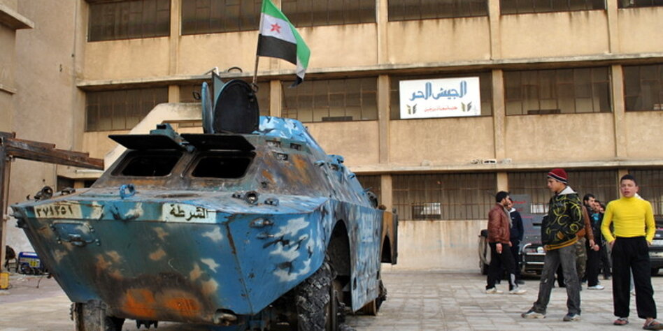 IMG Bild: Ein von syrischen Rebellen zerstörtes Fahrzeug der Polizei.