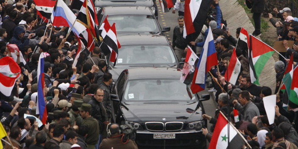 IMG Bild: Gefeiert von Assad-Anhängern: Konvoi des russische Außenministers in Damaskus.