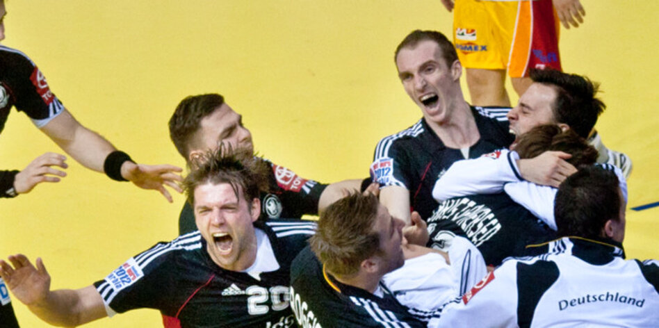 IMG Bild: Die deutsche Mannschaft feiert den Sieg gegen die Handballgroßmacht Mazedonien (zwei Millionen Einwohner) wie den Turniergewinn.