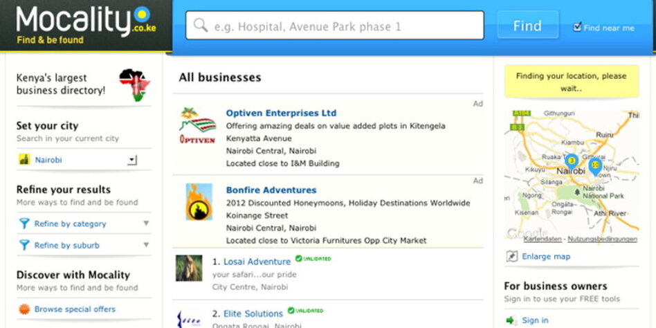 Mocality bietet in Kenia ein Firmenverzeichnis an, bei dem rund 100.000