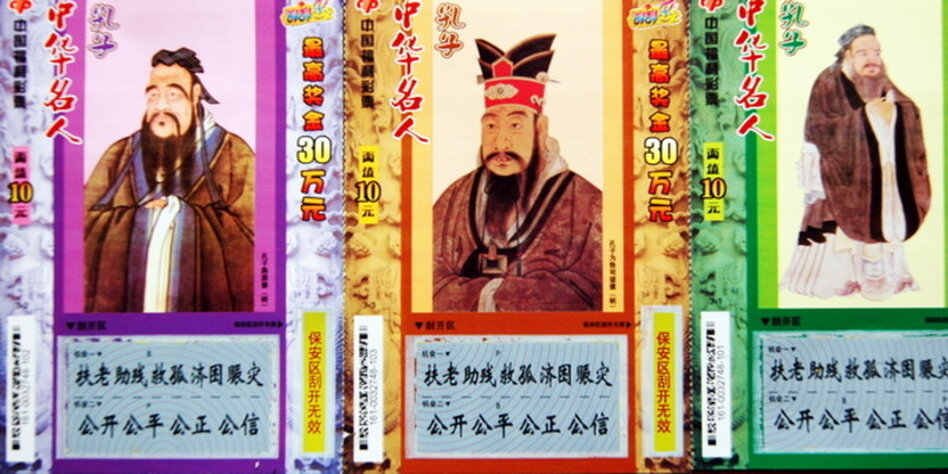 IMG Bild: Lotterie-Tickets mit Konfuzius-Motiv: Widerspruch zu seinem antimateriellen Image.
