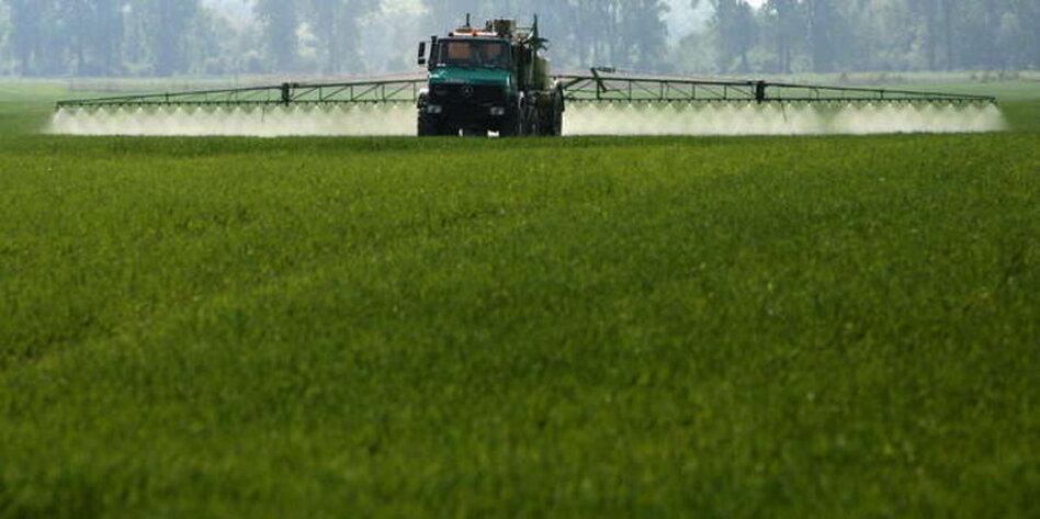 IMG Bild: Giftiger Schutz: Ein Bauer verteilt Spritzmittel auf einem Getreidefeld im Oderbruch nahe Wriezen in Brandenburg.