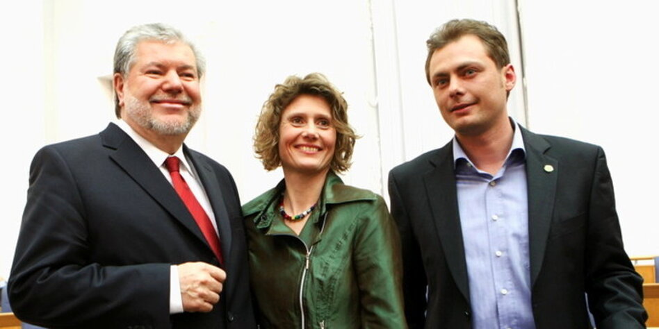 IMG Bild: SPD-Ministerpräsident Kurt Beck (l.) mit seinen wahrscheinlichen Regierungspartnern Eveline Lemke and Daniel Koebler von den Grünen.