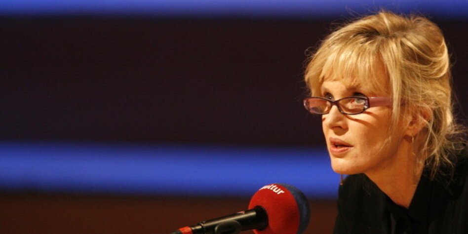 IMG Bild: Siri Hustvedt bei einer Lesung. In solchen Momenten erfährt sie immer mal wieder eine eigentümliche Trennung von Körper und Stimme.