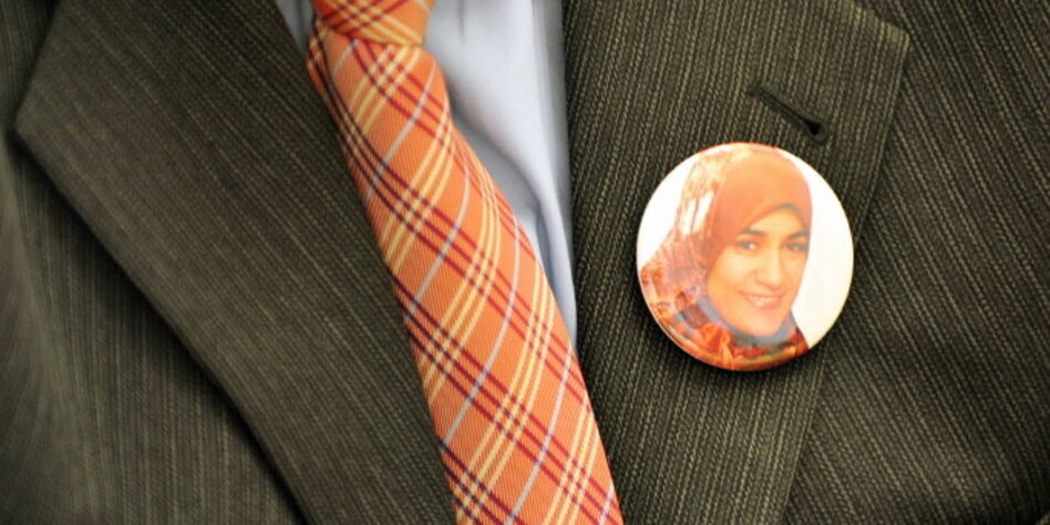 IMG Bild: Ein Button am Revers des Bruders der Ermordeten zeigt Marwa El-Sherbini.
