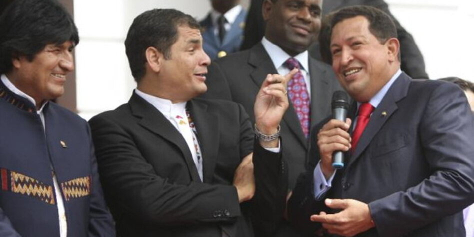 IMG Bild: Kurz vor der Geburt der alternativen Handelswährung: Evo Morales, Rafael Correa und Hugo Chavez in Caracas.