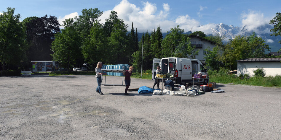 IMG Bild: Auf einem Parkplatz in Garmisch laden Teilnehmer des Anti-G-7-Camps eine mobile Küche aus.