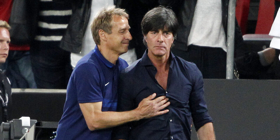 IMG Bild: Einer freut sich, einer nicht: die Trainer Klinsmann (l.) und Löw nach dem Spiel