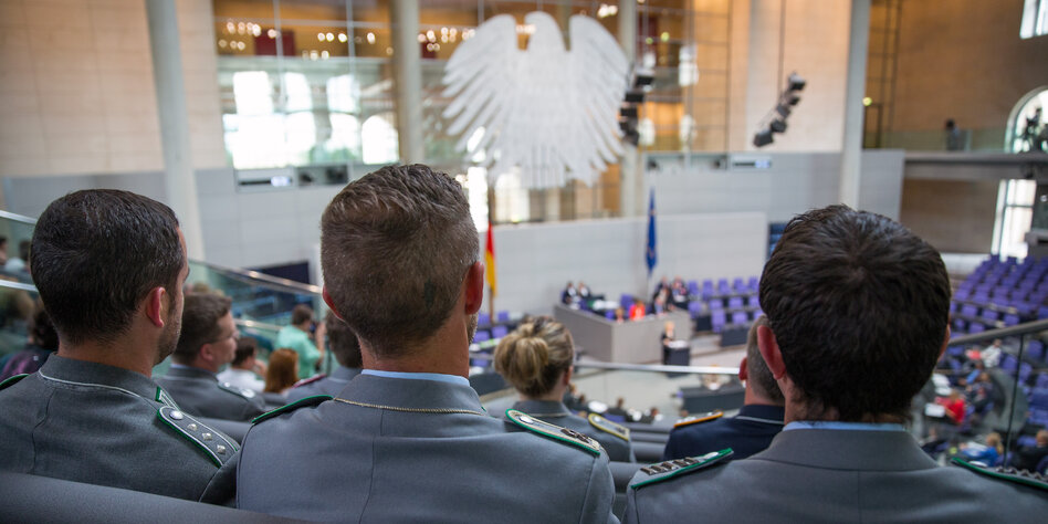 IMG Bild: Soldaten auf der Besuchertribüne des Bundestages: Von unten haben sie nichts zu befürchten.