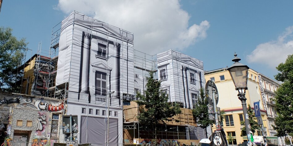 > Der Künstler Christoph Faulhaber hat eine historisierende Plane vor die