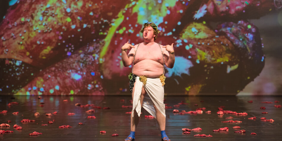 IMG Bild: Dionysos (Andrew Van Ostade) eröffnet und beendet die Spiele auf dem Mount Olympus.