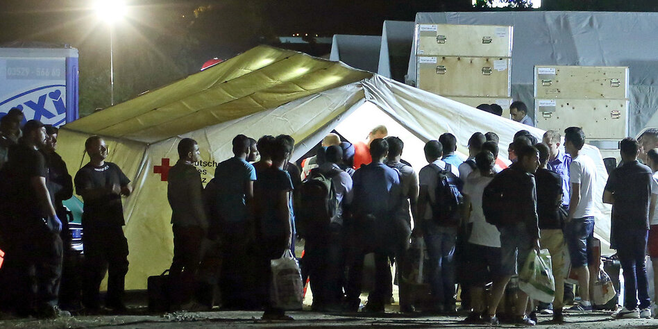 Flüchtlinge kommen in einem Zeltlager des Deutschen Roten Kreuzes an.