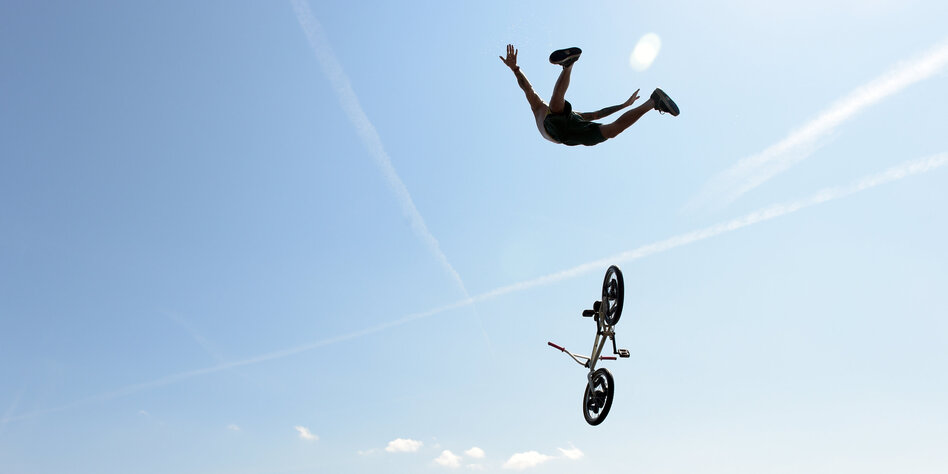 IMG Bild: Ein BMX-Fahrer schanzt in den Berliner Müggelsee, der hoffentlich noch nicht verdampft ist