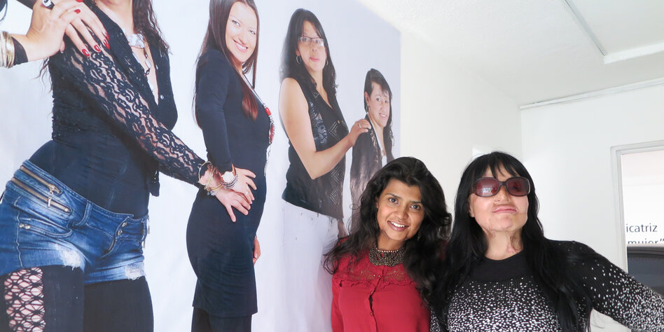 IMG Bild: „Eine Narbe macht dich nicht zu weniger Frau“ – Gina Potes (l.) und Nubia Espitia vor einem Plakat mit Frauen, die den Mut hatten, sich trotz Narben fotografieren zu lassen