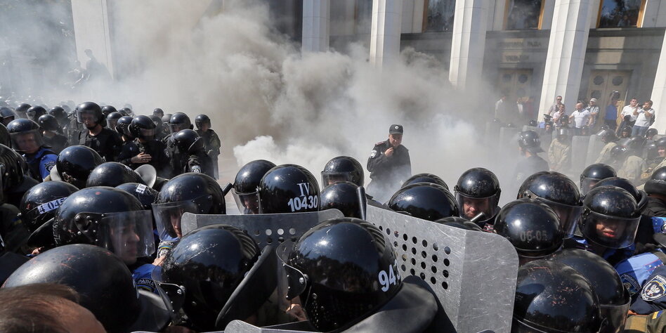 IMG Bild: Schwere Zusammenstöße zwischen Demonstranten und Sicherheitskräften am Montagnachmittag vor dem Parlament in Kiew.