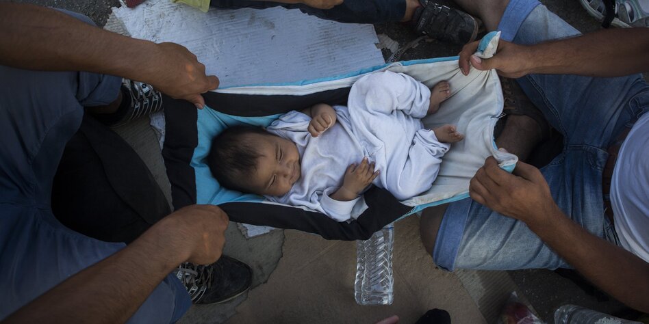 IMG Bild: Afghanische Flüchtlinge mit Baby nach ihrer strapaziösen Reise bei der Ankunft im Hafen von Mitylene auf der griechischen Insel Lesbos.