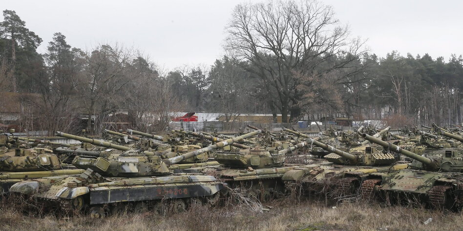 IMG Bild: Panzer-Parkplatz in Kiew – diese sind kaputt und werden im Konflikt nicht genutzt
