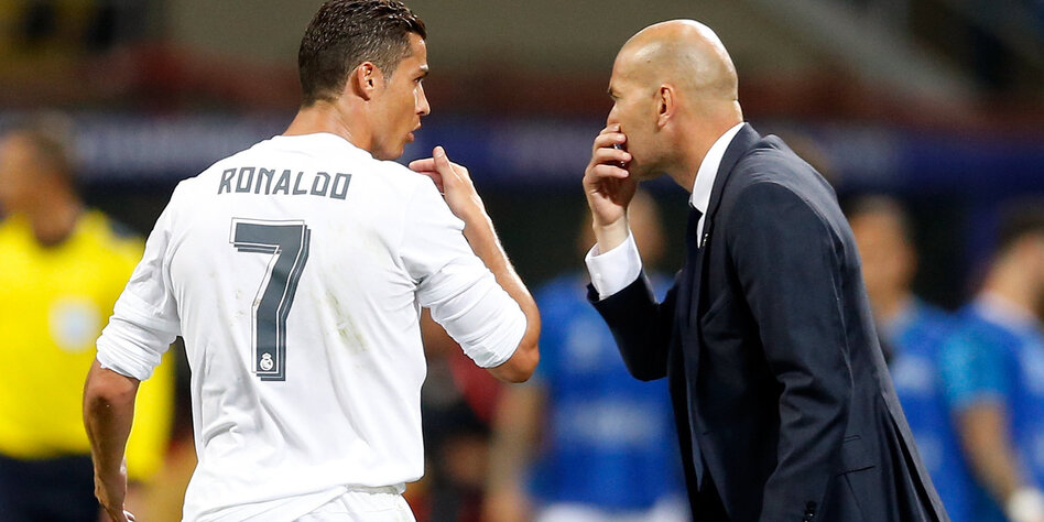 IMG Bild: Anweisungen hinter vorgehaltener Hand: Trainer Zinedine Zidane (r.) und Cristiano Ronaldo