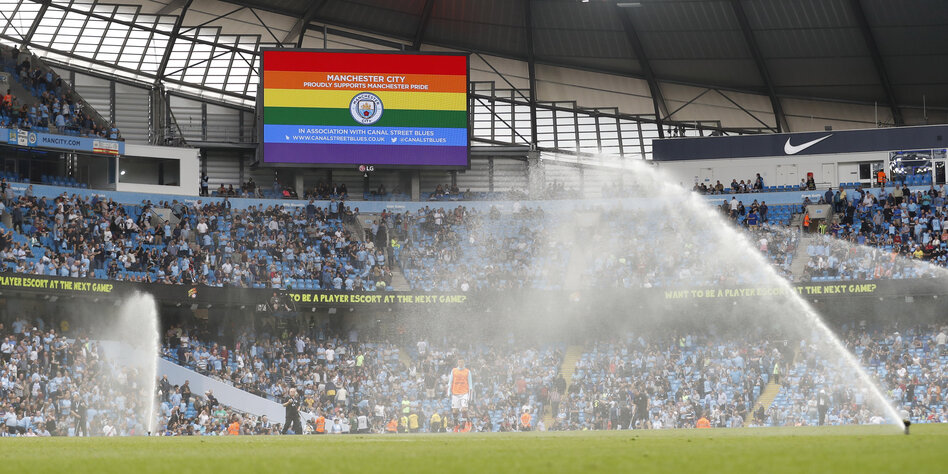 IMG Bild: Eine Regenbogenflagge auf den Bildschirmen des Stadions von ManCity – sowas gibt es woanders nur selten zu sehen
