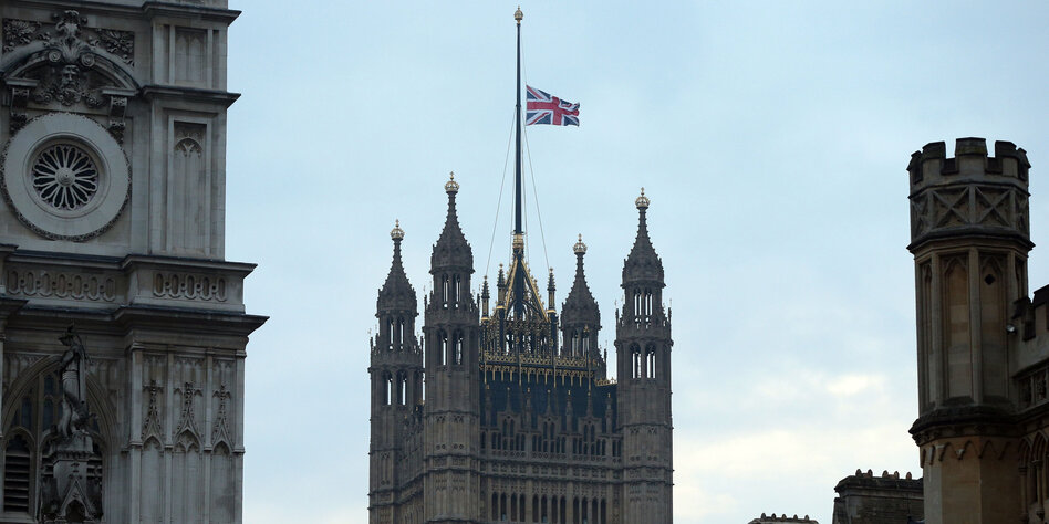 IMG Bild: Die Flagge auf dem Westminster-Palast, dem Sitz des britischen Parlaments, in London weht am 23. März auf Halbmast