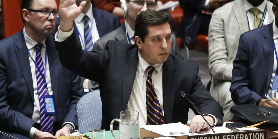 IMG Bild: Russlands stellvertretender UN-Botschafter Wladimir Safronkow legt sein sein Veto ein