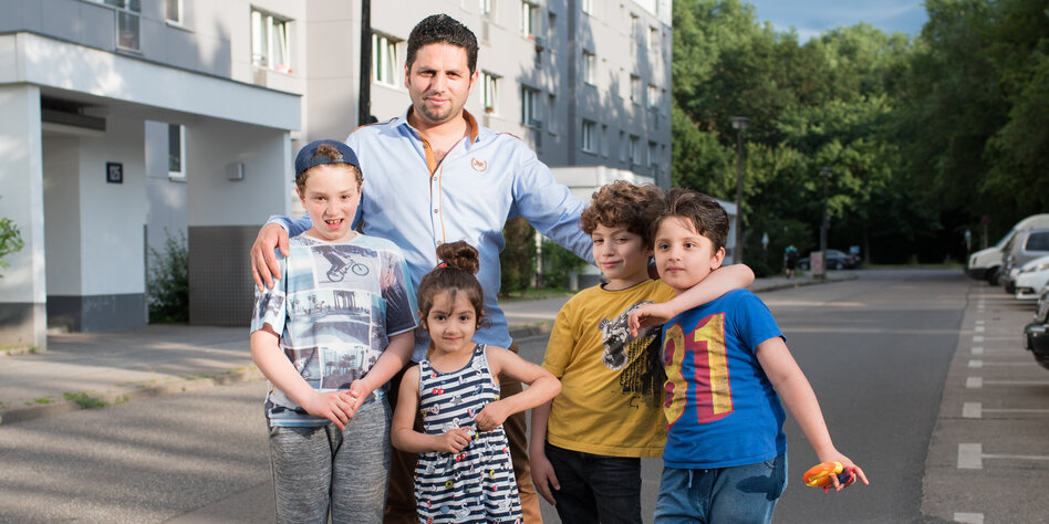 IMG Bild: Mahmoud Mottaweh aus Damaskus mit vier seiner fünf Kinder vor dem Lichtenberger Flüchtlingsheim, in dem die Familie wohnt