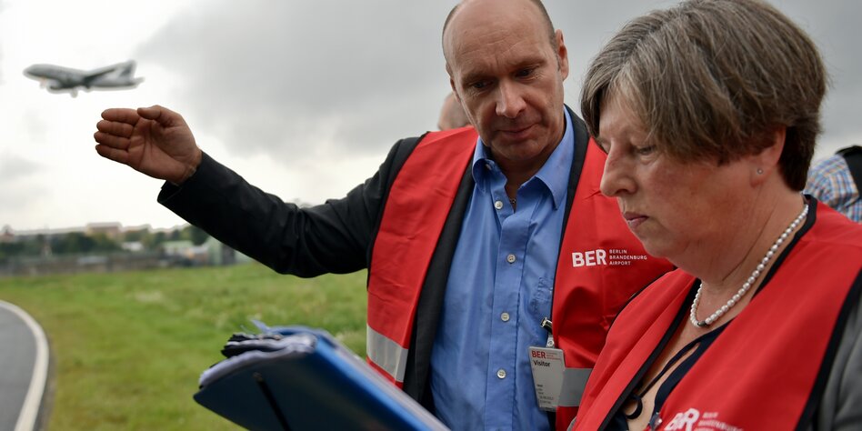 IMG Bild: Wollen hier lieber Wohnungen statt Flieger sehen: Stadtentwicklungssenatorin Katrin Lompscher und Linken-Fraktionschef Udo Wolf auf dem TXL-Gelände