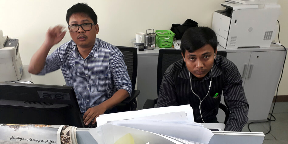 IMG Bild: Wa Lone (links) und Kyaw Soe Oo am Montag in ihrem Büro. Mittlerweile sind sie in Haft