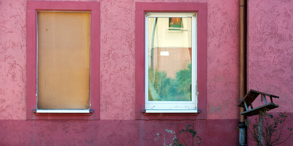 IMG Bild: Nach dem Anschlag auf ein Asylbewerberheim in Freital 2015 sind die gebrochenen Fensterscheiben mit Holzplatten verdeckt