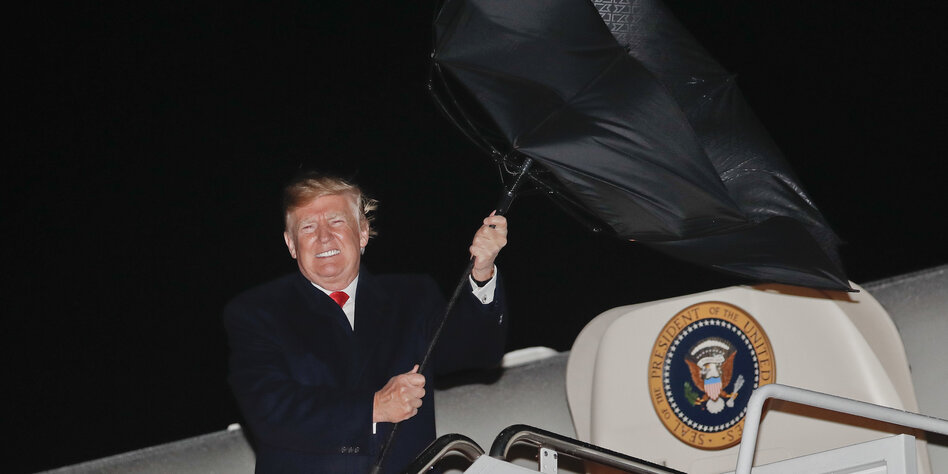 IMG Bild: Kämpfte in Wahrheit natürlich nie mit einem Regenschirm: US-Präsident Donald Trump vor seinem Dienstflugzeug Air Force One