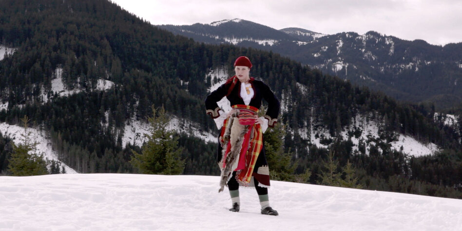 Gery Georgieva (s.o.) vermengt in ihrer Videoarbeit Codes von Pop, Folklore