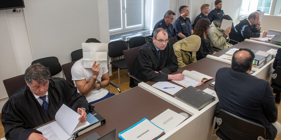 IMG Bild: Die vier angeklagten Geflüchteten (verdeckt) mit ihren Anwälten im Amtsgericht Amberg