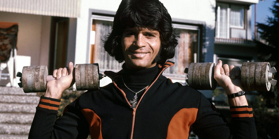 IMG Bild: Costa Cordalis stemmt Hanteln im November 1976 vor seinem Haus in Kniebis bei Freudenstadt