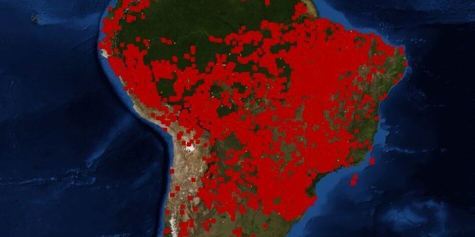 Man sieht Südamerika von oben und viele rote Punkte, wie echte Feuer.