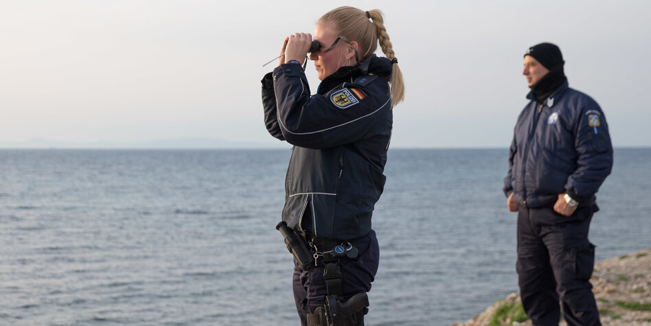 IMG Bild: Am Rand des Imperiums: eine deutsche Grenzschützerin mit ihrem Frontex-Kollegen auf Lesbos, 2016