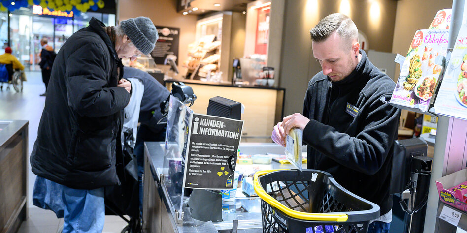 IMG Bild: Nix mit Schutz: Ein Edeka-Mitarbeiter bedient am 24. März in Stuttgart einen Kunden