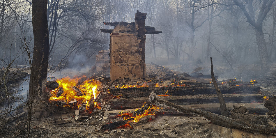 IMG Bild: Mehrere Wohnhäuser sind schon den Flammen rund um Tschernobyl zum Opfer gefallen